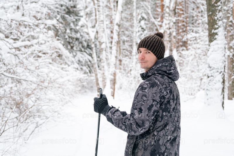 Лыжник в шляпе с помпоном с лыжными палками в руках спиной на фоне заснеженного леса. Беговые лыжи в зимнем лесу, спорт на открытом воздухе, здоровый образ жизни