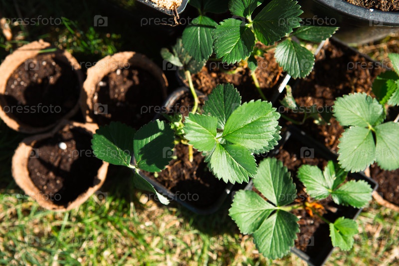 Саженцы клубники в торфяных стаканах на траве, готовые к посадке в саду. Подготовка к посадке, выращивание натуральных ягод на грядке