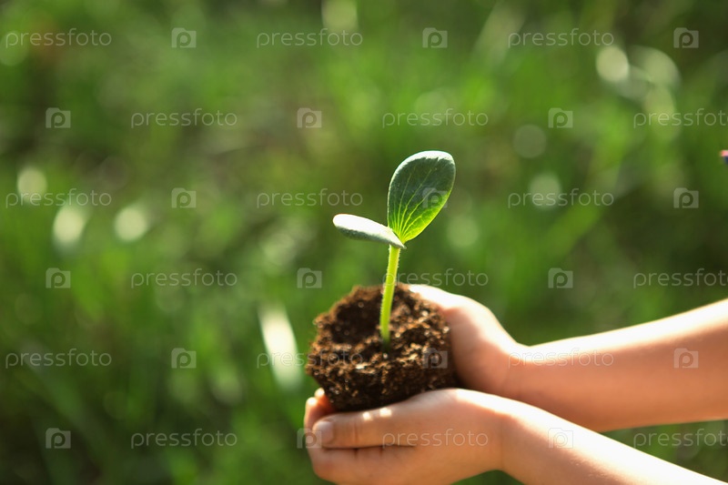 Молодой зеленый росток в руках ребенка в свете солнца на фоне зеленой травы. Натуральные саженцы, экологичность, новая жизнь, молодость. Концепция развития, мира, заботы