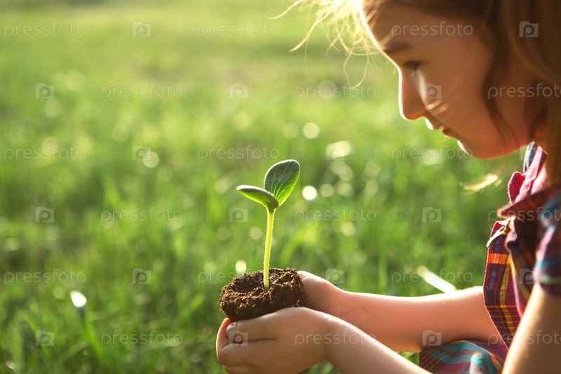 Молодой зеленый росток в руках ребенка в свете солнца на фоне зеленой травы. Натуральные саженцы, экологичность, новая жизнь, молодость. Концепция развития, мира, заботы