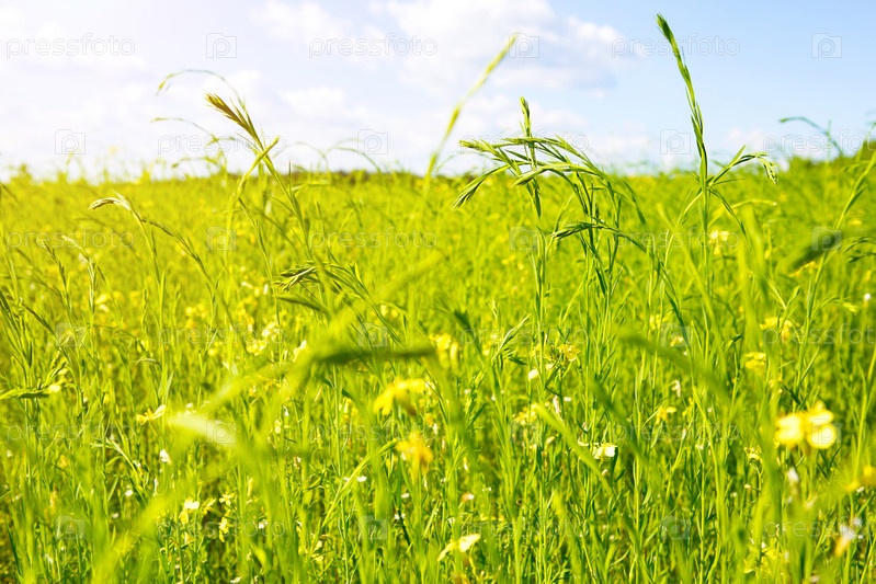 Зеленое весеннее поле с яркими колосьями цветущего льна. Сельское хозяйство, экология, весеннее время