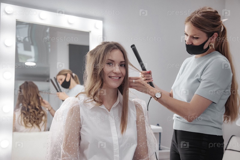 Парикмахер делает прическу милой красивой молодой женщине в салоне красоты