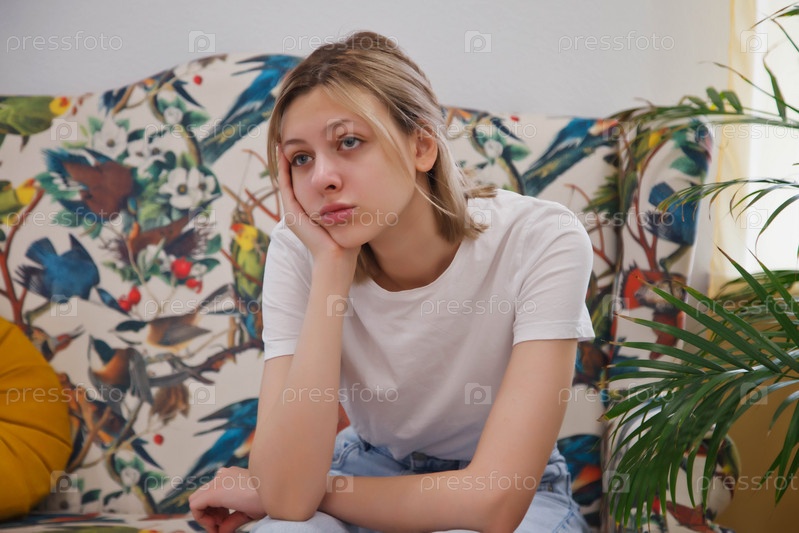 Грустная молодая женщина сидит в зале ожидания, ожидая своей очереди. Женщина, сидящая на диване, чувствует себя некомфортно. Концепция длительного ожидания в учреждениях и больницах. Выборочный фокус на переднем плане