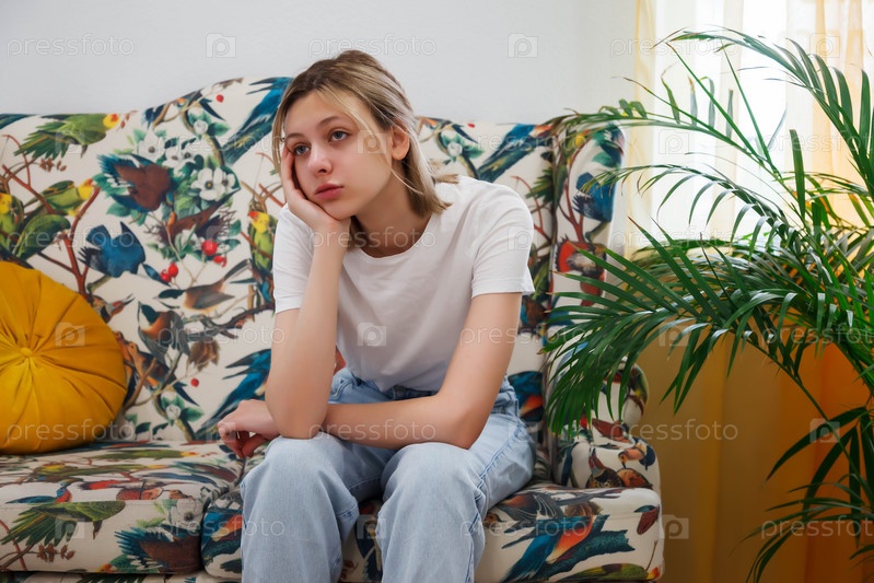 Грустная молодая женщина сидит в зале ожидания, ожидая своей очереди. Женщина, сидящая на диване, чувствует себя некомфортно. Концепция длительного ожидания в учреждениях и больницах. Выборочный фокус на переднем плане