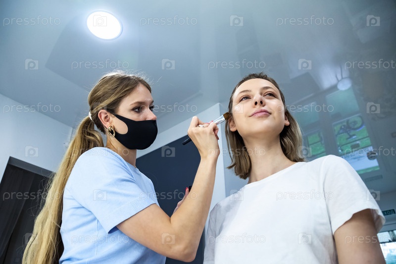 Профессиональный косметолог работает над молодой леди, создавая естественный вид в салоне красоты