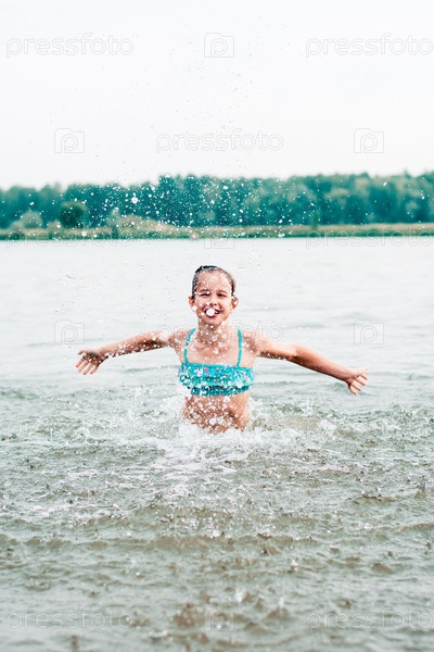 Веселая девушка стоит, раскинув руки, за брызгами реки. Местный туризм