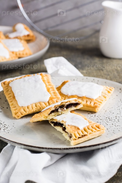 Сломанные глазированные домашние поп-тарталетки на тарелке на столе. Американская выпечка. Вертикальный вид