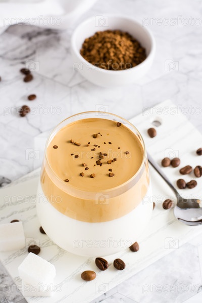 Dalgona coffee - модное корейское кофе с льдом в стакане на столе.Напиток из социальных сетей. Вертикальный вид