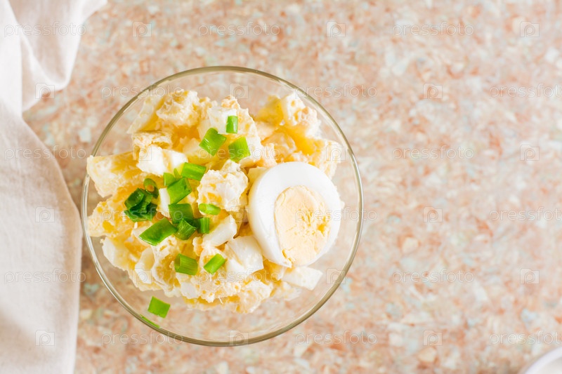 Домашний картофельный салат с яйцом и зеленым луком в миске на столе. Вид сверху. Крупный план