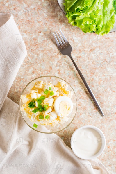 Картофельный салат с вареным яйцом, зеленым луком и майонезом в миске. Верхний и вертикальный вид
