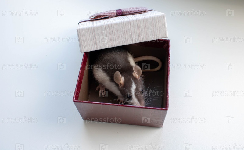 Маленькая крыса сидит в подарочной коробке