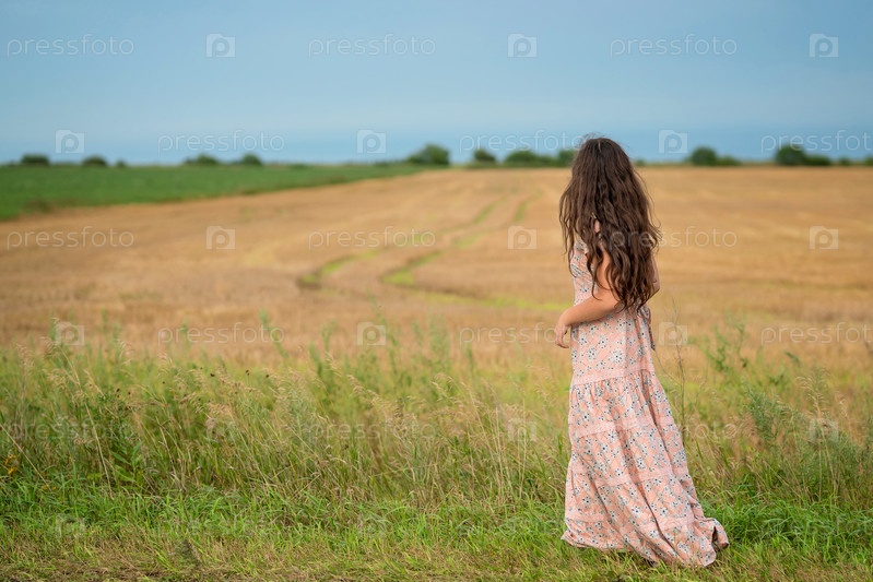 Красивая молодая девушка гуляет по полю. Девушка в деревенском платье с длинными волосами стоит спиной к камере