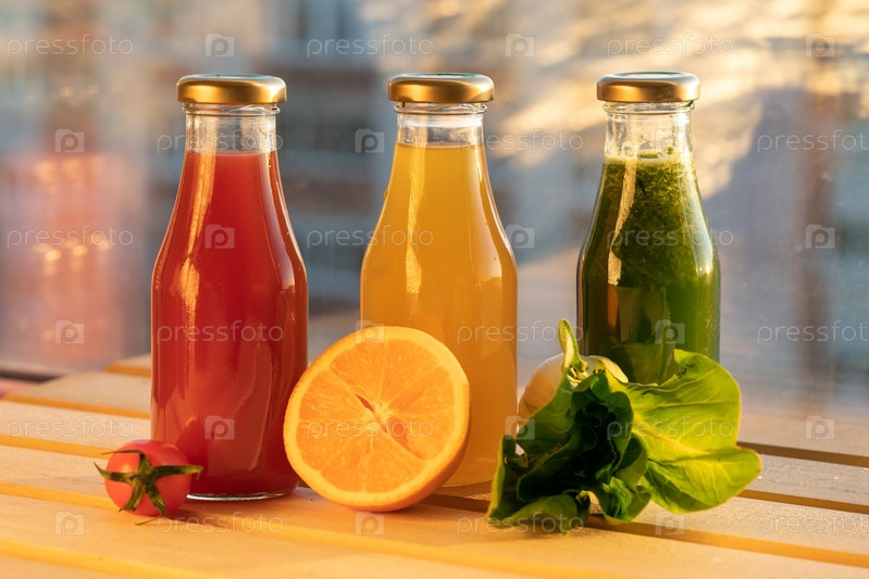 В холодильнике на полке стоят стеклянные бутылки со свежевыжатым соком, а также фрукты и овощи