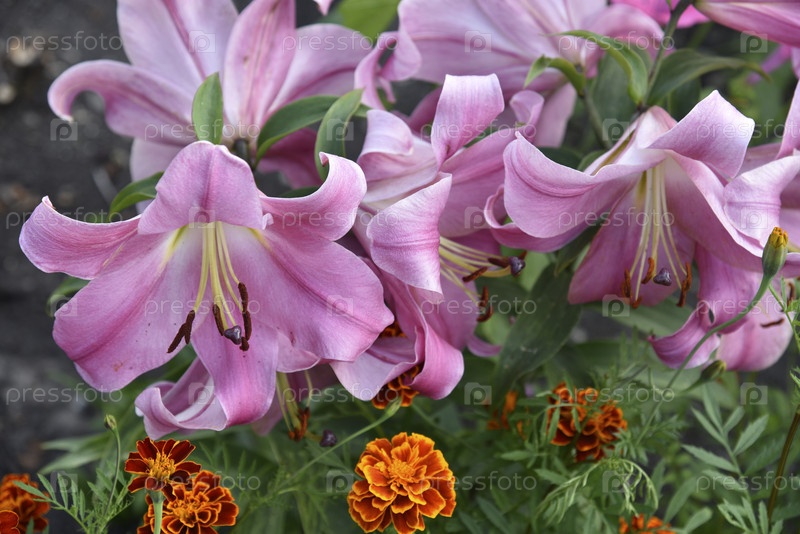 Светло-розовые лилии в летнем саду. Красивые крупные цветы розовых лилий. Лилии крупным планом