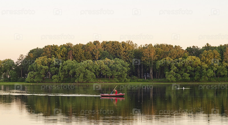 Летние каникулы на реке. Спортивное катание на лодках на закате