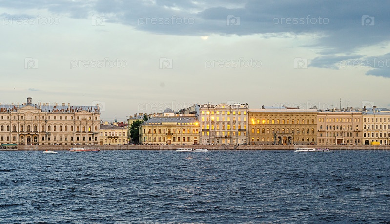 Речной канал города и вид на исторические красивые здания на набережной на закате. речные корабли с туристами плывут в жалости