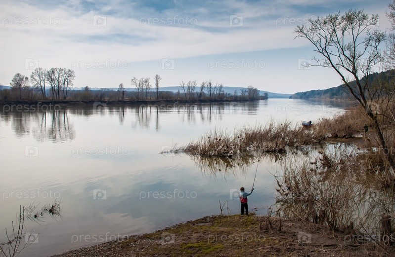 Кузбасс, река Томь весенний разлив. Рыбалка на берегу реки утром. весенняя рыбалка на природе. одинокий рыбак с удочкой на берегу