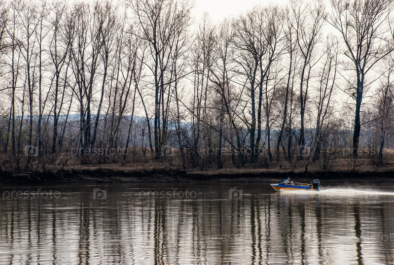 Кузбасс, река Томь. Рыбалка на берегу реки утром. весенняя рыбалка на природе. моторная лодка с рыбаком плывет по реке