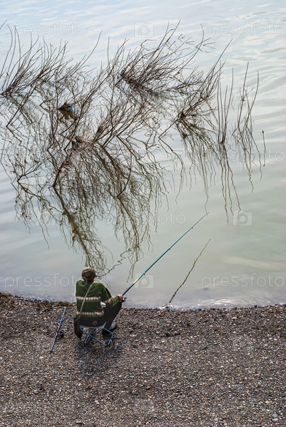 Кузбасс, река Томь. Вид сверху рыбак ловит рыбу на удочку и сидит на стуле, весенняя рыбалка на природе