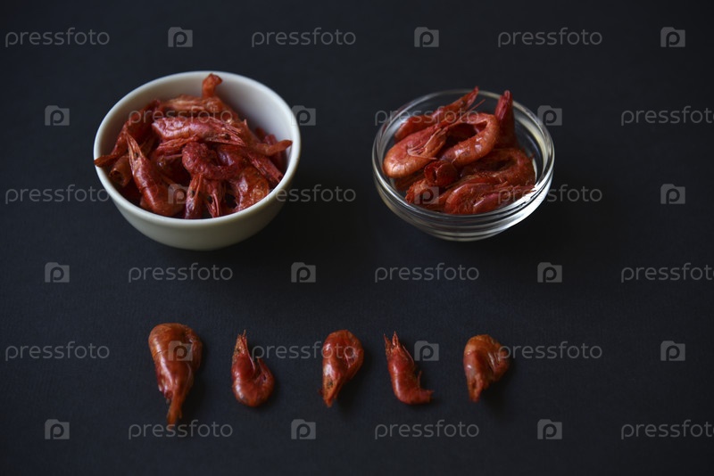 Красные сушеные креветки с перцем для пива на черном фоне