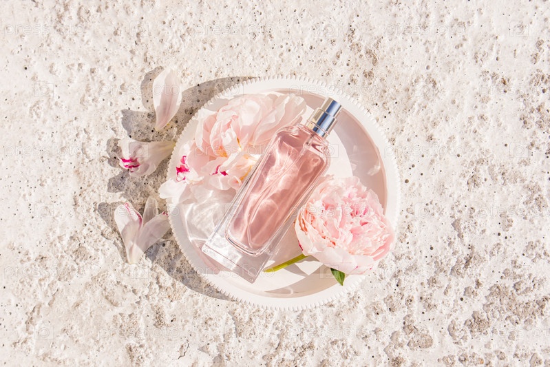 Элегантный флакон женских духов или туалетной воды лежит на белом гипсовом подносе с лепестками пиона. вид сверху. лучи солнца