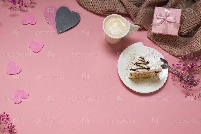Плоская планировка дня святого валентина, торт и кофейная кружка