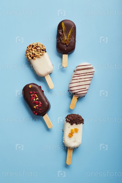 Муссовый десерт с фруктовыми вкусами в виде мороженого эскимо, покрытый белым и темным шоколадом на голубом фоне
