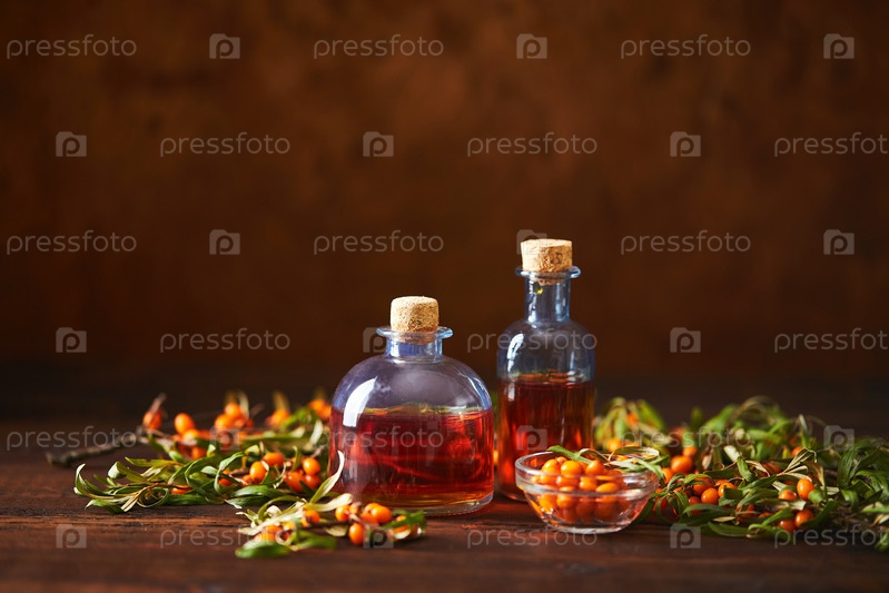 Стеклянная бутылка с ягодами облепихового масла и ветвями облепихи на деревянном фоне