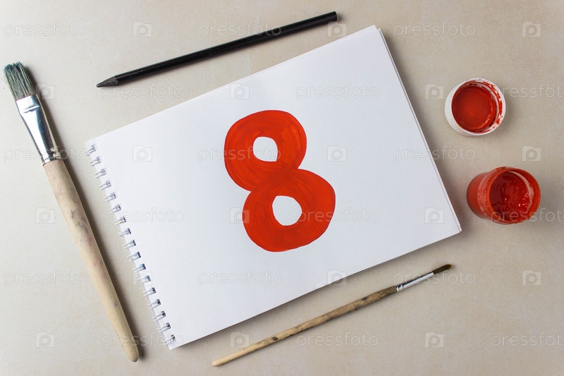 Рисунок красного номера на белом альбомном листе. Рядом кисти и баночка с краской