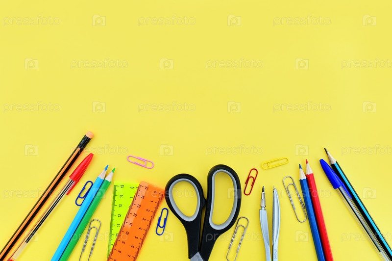 Концепция «Снова в школу». 1 сентября. Школьные принадлежности, аксессуары для занятий - карандаши, тетради, ножницы, скрепки