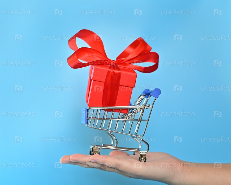 Красная коробка с бантом в тележке. Концепция покупки подарков к праздникам. Распродажа