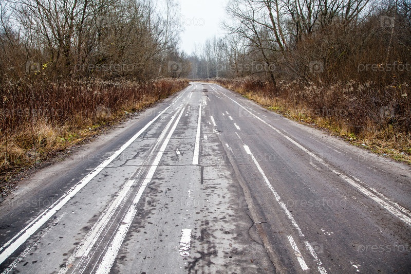 Старая заброшенная асфальтовая дорога с испорченной дорожной разметкой