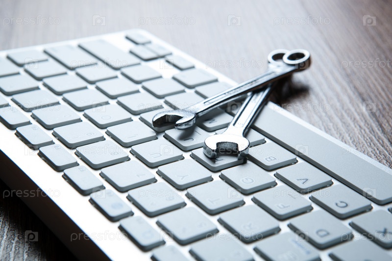 Два гаечных ключа и клавиатура компьютера крупным планом