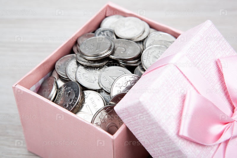 Открытая розовая подарочная коробка с монетами российского рубля