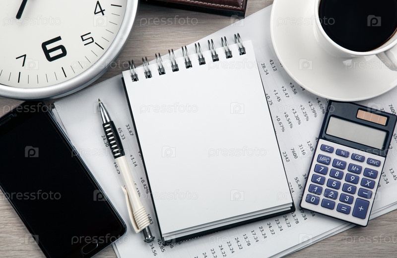 Деловой натюрморт из блокнота, смартфона, часов, чашки кофе, калькулятора