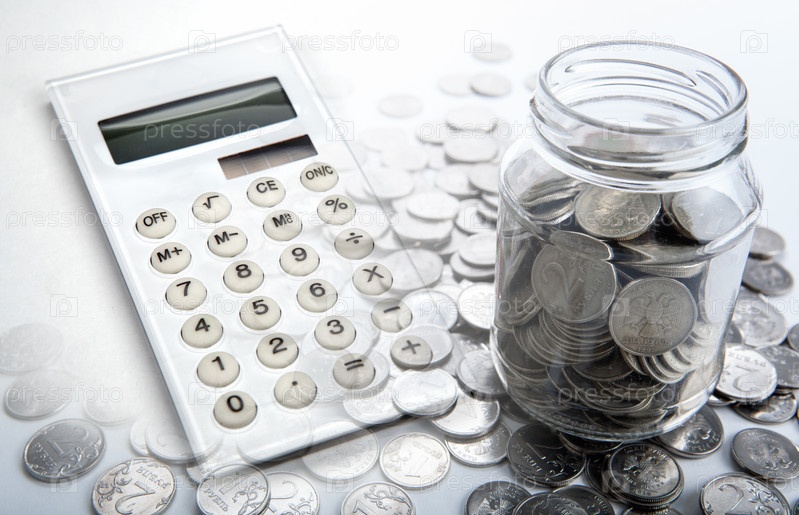 Калькулятор и стеклянная банка с монетами российского рубля