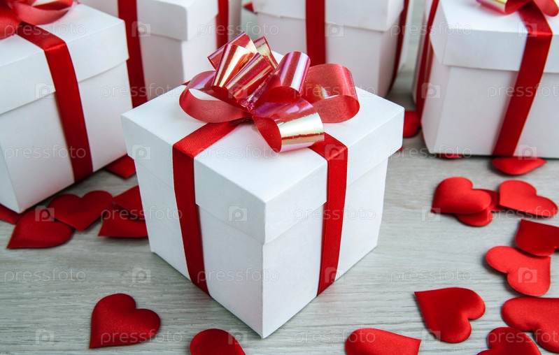 Белая подарочная коробка на фоне других подарочных коробок с сердечками