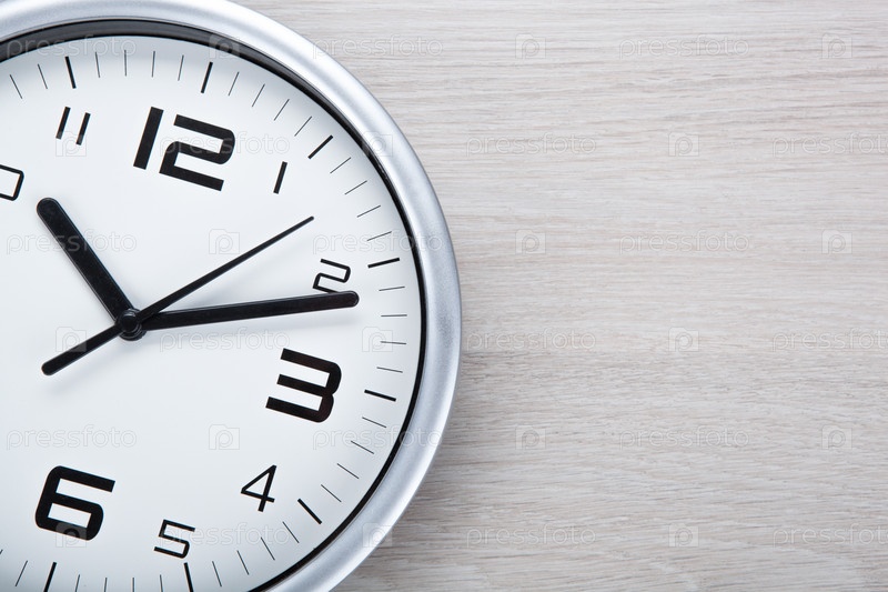 Белый циферблат с черными цифрами на деревянном сером фоне