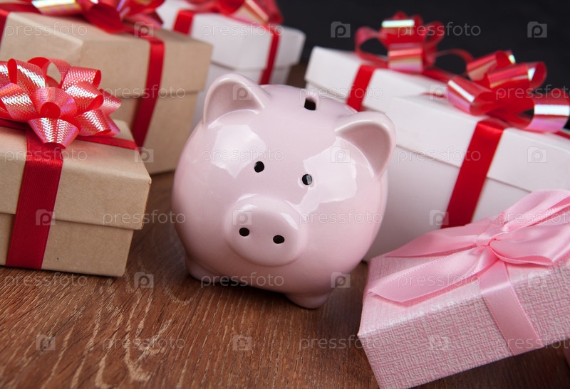 Розовая копилка с подарочными коробками с красными бантами