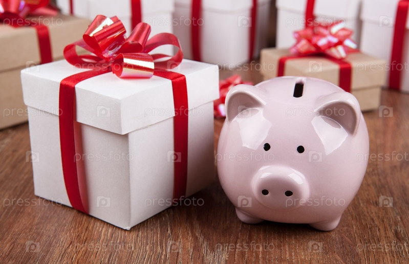 Розовая копилка с подарочными коробками с красными бантами