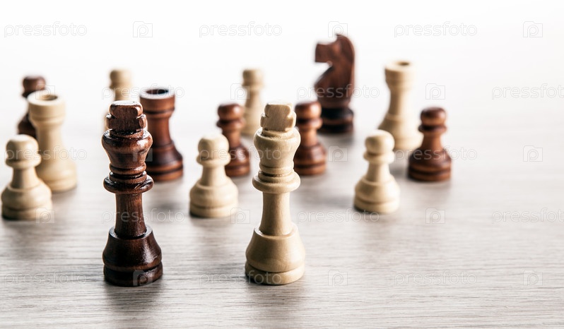 Деревянные шахматные фигуры на сером фоне и черно-белые шахматные короли