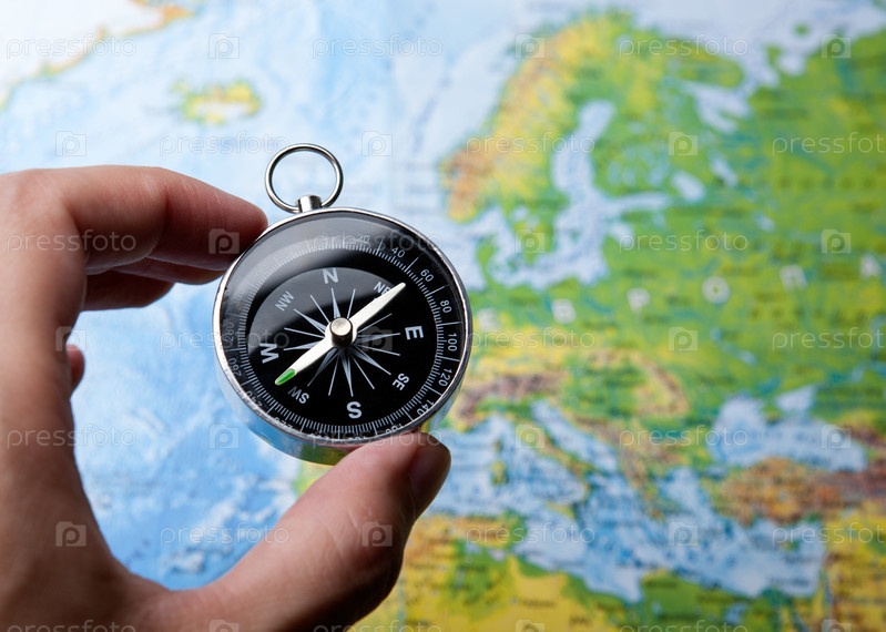 Компас в руке на фоне карты мира