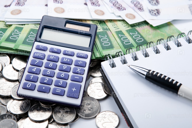 Деловой натюрморт из калькулятора и пачки российских банкнот
