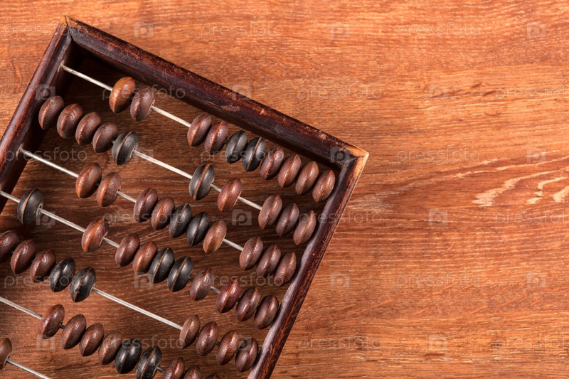 Антикварные счеты на деревянном столе в качестве фона, вид сверху