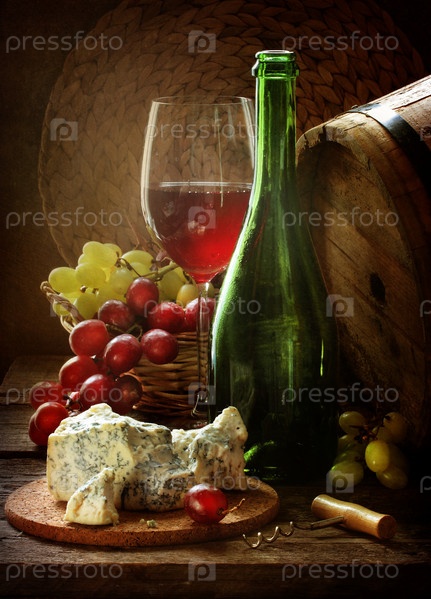 Вино с сыром и виноградом на деревянном столе