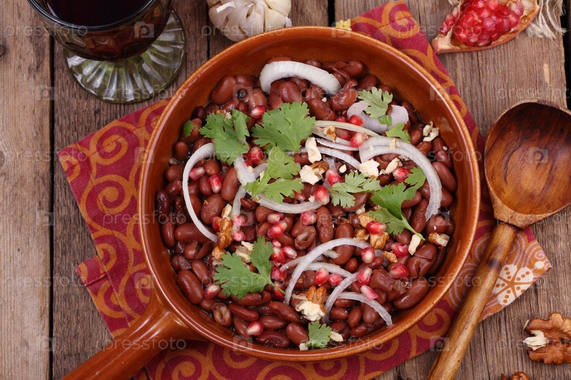 Лобио с кукурузной кашей с брынзой и красный вином