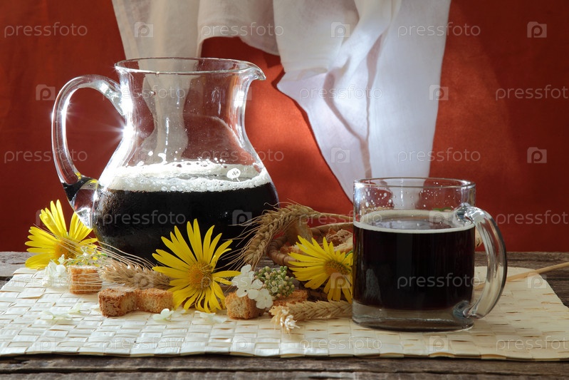 Домашний квас на деревянном фоне с колосками и ржаным хлебом