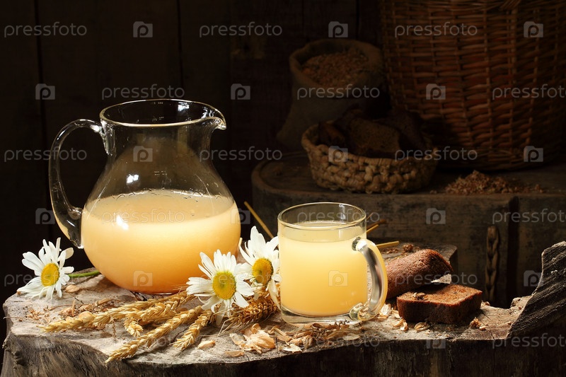 Домашний квас на деревянном фоне с колосками и ржаным хлебом