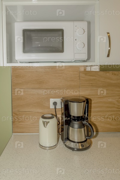 Новый, большой, современный электрический чайник, кофемашина и микроволновая печь крупным планом
