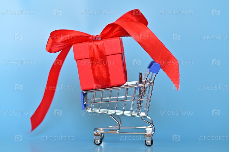 Красная коробка с бантом в тележке. Концепция покупки подарков к праздникам. Распродажа